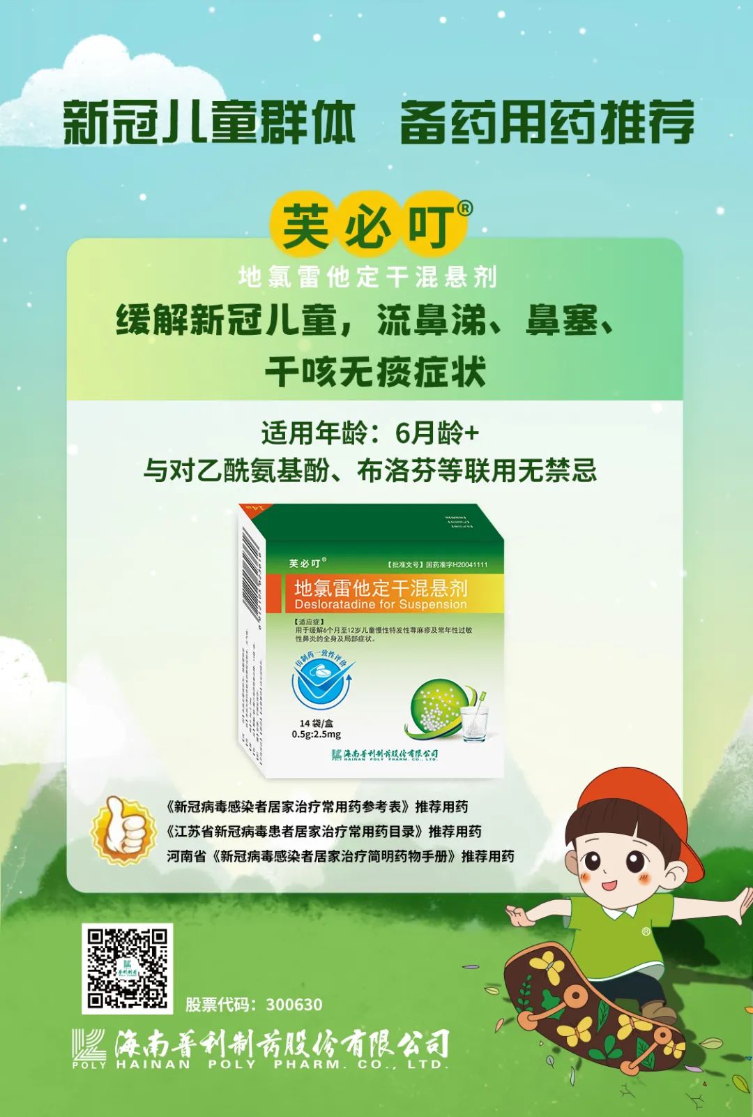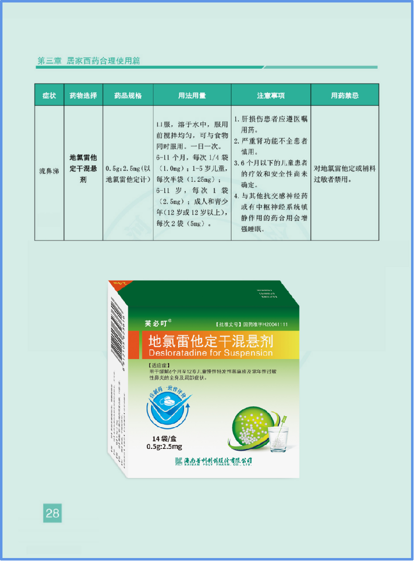 本次目录在儿童西药治疗推荐药物模块,推荐芙必叮-地氯雷他定干混悬剂,用于6个月及以上儿童“流鼻涕”症状。